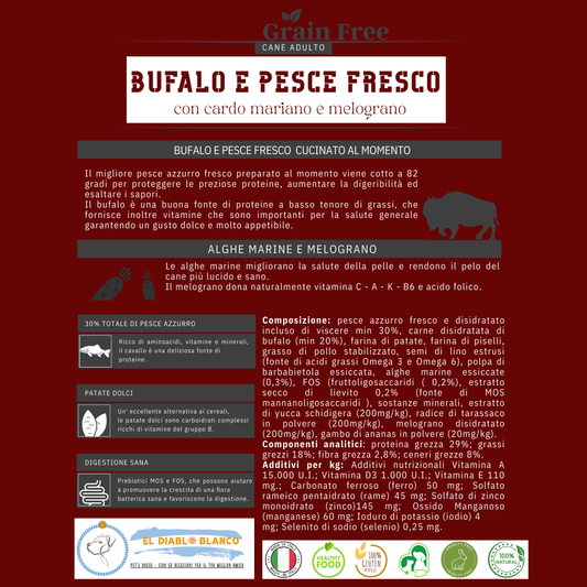 Cibo Naturale senza cereali Multiproteico al Bufalo e Pesce Fresco – con Carbo Mariano e Melograno🥩🐟🌿