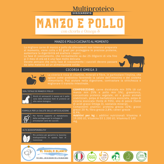 Cibo Naturale Svezzamento Multiproteico al Manzo e Pollo – con Cicoria e Omega3/6🥕🥦