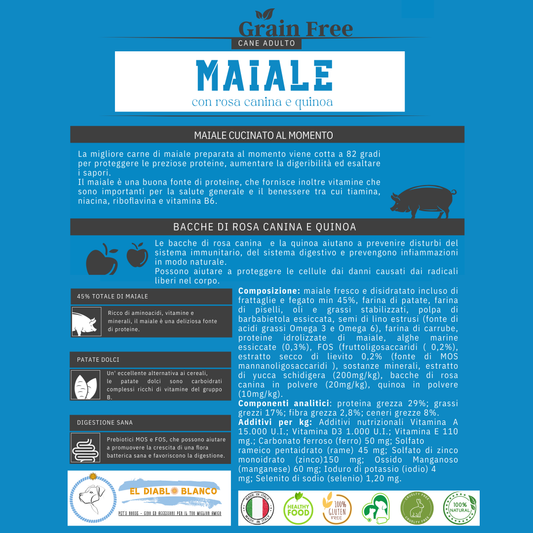 Cibo Naturale Monoproteico al Maiale – Senza Cereali, con Rosa Canina e Quinoa 🌸