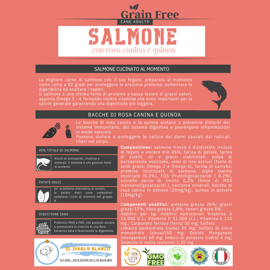 Cibo Naturale Monoproteico al Salmone – Senza Cereali, con Rosa Canina e Quinoa 🌸